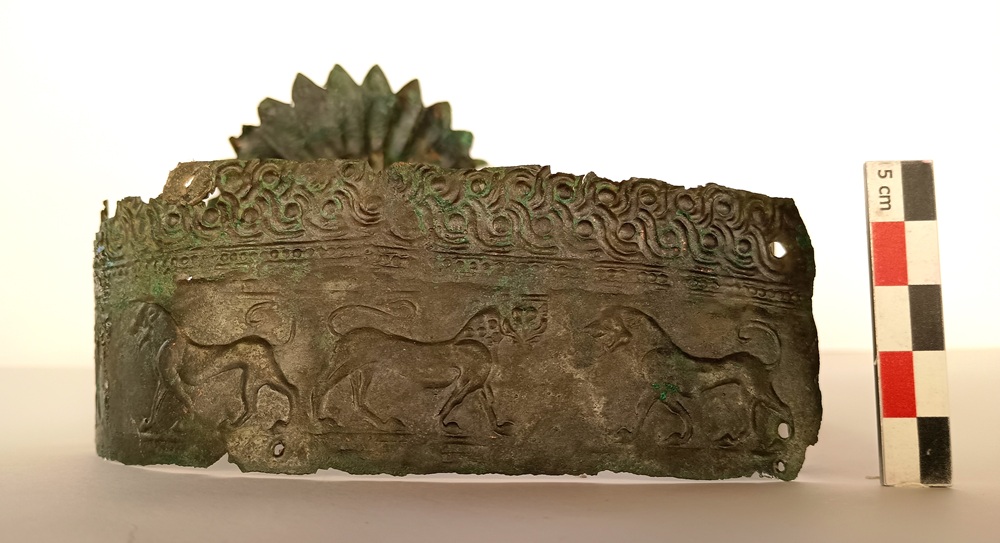 Ιδιαίτερα εντυπωσιακή είναι η «Ταφή της αρχόντισσας με το ανεστραμμένο διάδημα», που χρονολογείται στο β΄ μισό του 7ου αι. π. Χ.  και αποτελεί μέρος μιας  συστάδας τριών λακκοειδών τάφων. Η ταφή της αρχόντισσας σύμφωνα με την προκαταρκτική εξέταση των οδοντικών καταλοίπων, ανήκει σε ενήλικη γυναίκα 20-30 ετών. Στην κεφαλή της είχε τοποθετηθεί τελετουργικά, ως σύμβολο της υπεροχής και του αξιώματός της, εντυπωσιακό χάλκινο ταινιωτό διάδημα με επίστεψη μεγάλου ρόδακα, «εν είδει ήλιου» στο κέντρο του μετώπου. Το περίτεχνο διάδημα είναι κατασκευασμένο με την έκκρουστη τεχνική και φέρει  τρέχουσα διακόσμηση αντωπών ζευγών εραλδικών λεόντων, αρσενικού και θηλυκού γένους, ζώων που κατεξοχήν συμβολίζουν τη βασιλική δύναμη και εξουσία. Ωστόσο το διάδημα είχε τοποθετηθεί στην κεφαλή της νεκρής ανεστραμμένο με τους λέοντες σε ύπτια θέση και το κόσμημα πλοχμού στο κάτω άκρο του. Στη σύγχρονη εποχή το στέμμα του βασιλιά φορεμένο ανεστραμμένο, συμβολίζει την παραίτηση ή την πτώση του μονάρχη, και σε κάθε περίπτωση σηματοδοτεί την απώλεια της εξουσίας και του αξιώματός του.