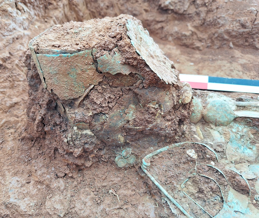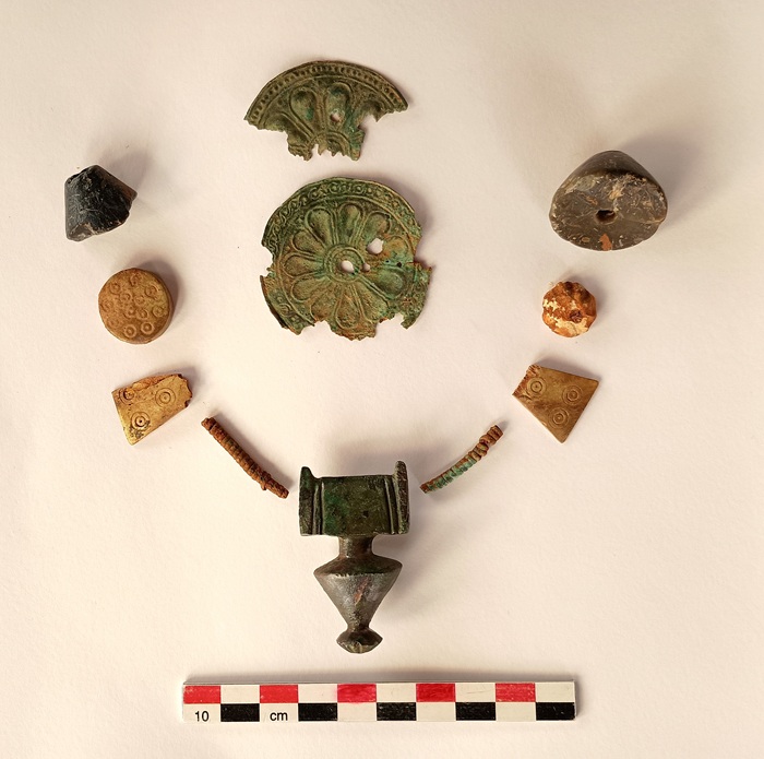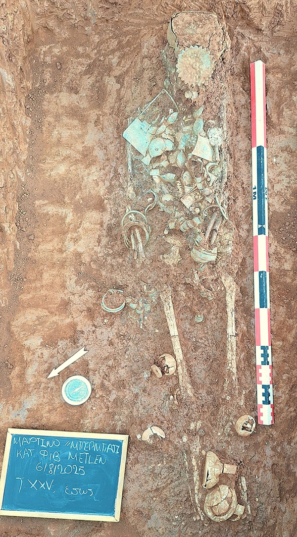 Το αξίωμα, το κύρος και ο πλούτος της εν λόγω ταφής αποδεικνύεται από τα πολυάριθμα χάλκινα κτερίσματα. Εντυπωσιακό είναι το πλήθος των κτερισμάτων, ανάμεσα στα οποία ξεχωρίζουν οι δυο υπερμεγέθεις πόρπες βοιωτικού τύπου με εγχάρακτη γεωμετρική διακόσμηση αλόγων, το περιδέραιο με μεγάλο αγγειόσχημο περίαπτο, οι οστέινες, ελεφαντοστέινες χάνδρες, οι ψήφοι από ήλεκτρον (κεχριμπάρι), οι ελασμάτινοι ρόδακες, τα χάλκινα ενώτια, τα ψέλλια (βραχιόλια) και τα σπειροειδή δακτυλίδια που φορούσε σε όλες τις φάλαγγες των δακτύλων .