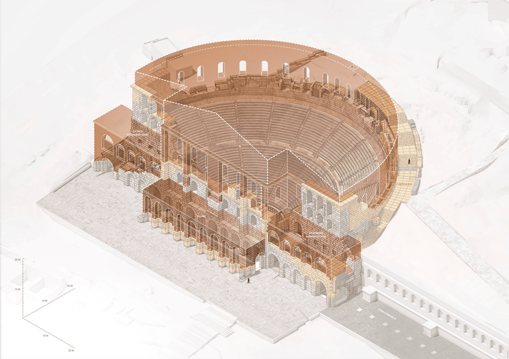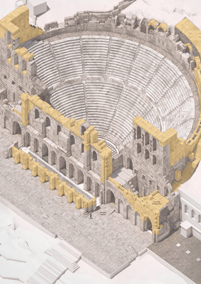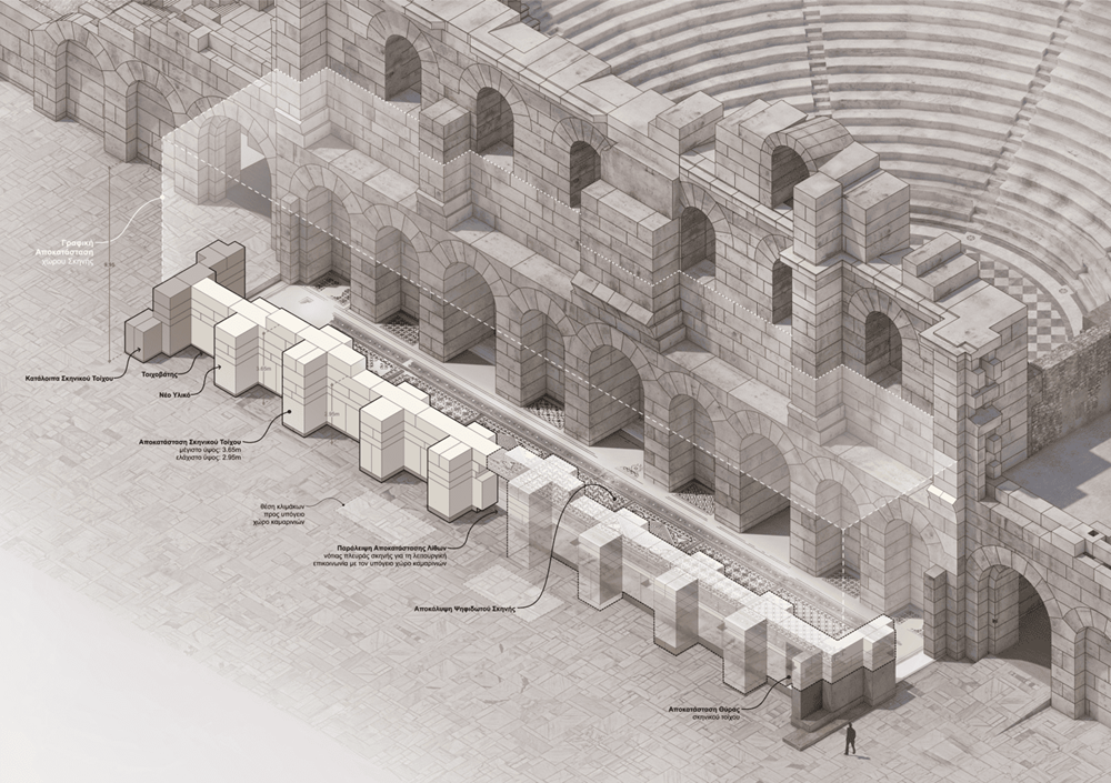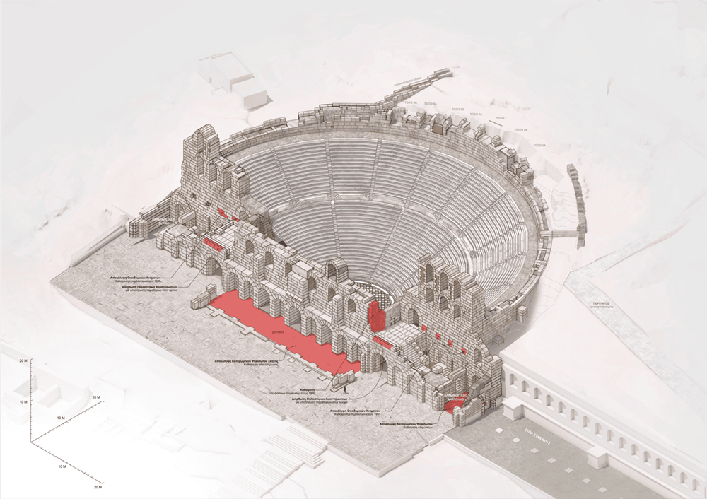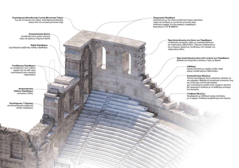 - Στο κοίλο, όπου θα συνεχιστεί η συντήρηση των αυθεντικών μαρμάρινων μελών και οι συμπληρώσεις εδωλίων, καθώς αυτά καταπονούνται από τη χρήση του κοινού στη διάρκεια των παραστάσεων.
