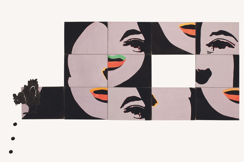 Εκφράζοντας ορισμένους ψυχολογικούς ορισμούς – και λοιπόν, τι γίνεται με την κότα;, 1966 Λάδι και ακρυλικό σε μουσαμά, 150×360 εκ. Δωρεά Αλέξανδρου Ιόλα MOMUS-Μουσείο Σύγχρονης Τέχνης-Συλλογές Μακεδονικού Μουσείου Σύγχρονης Τέχνης και Κρατικού Μουσείου Σύγχρονης Τέχνης