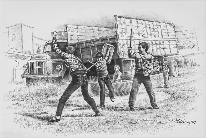 Γιάννης Τσατσαγιάς: Ένας αυτοδίδακτος καλλιτέχνης με πορεία που εμπνέει ανθρωπιά, αντοχή, επιμονή, κατάφαση ζωής. Ηθοποιός σε μπουλούκια, μανάβης, ποιητής, φιλόσοφος, περιπτεράς, μας γνωρίζει «το βάρος της Ελαφρότητας» με μόνο εφόδιο το «μαύρο μπικ», αναπτύσσοντας με αυτό μια δεξιοτεχνική τεχνοτροπία για να υποκαταστήσει τις πρακτικές δυσκολίες διάρκειας του κάρβουνου, όταν αποδίδει με ‘φωτογραφική’ ακρίβεια θέματα που σχολιάζουν βιωματικά τον κόσμο του. Σαράντα χρόνια μετά, ένας προικισμένος νέος καλλιτέχνης από τη Δράμα, ο Γιώργος Ταξίδης, κερδίζει τον χώρο με το κάρβουνο που αναγκάστηκε να απορρίψει ο Τσατσάγιας, στην ίδια αισθητική καταγραφής αξιών και εσωτερικού θάλπους.