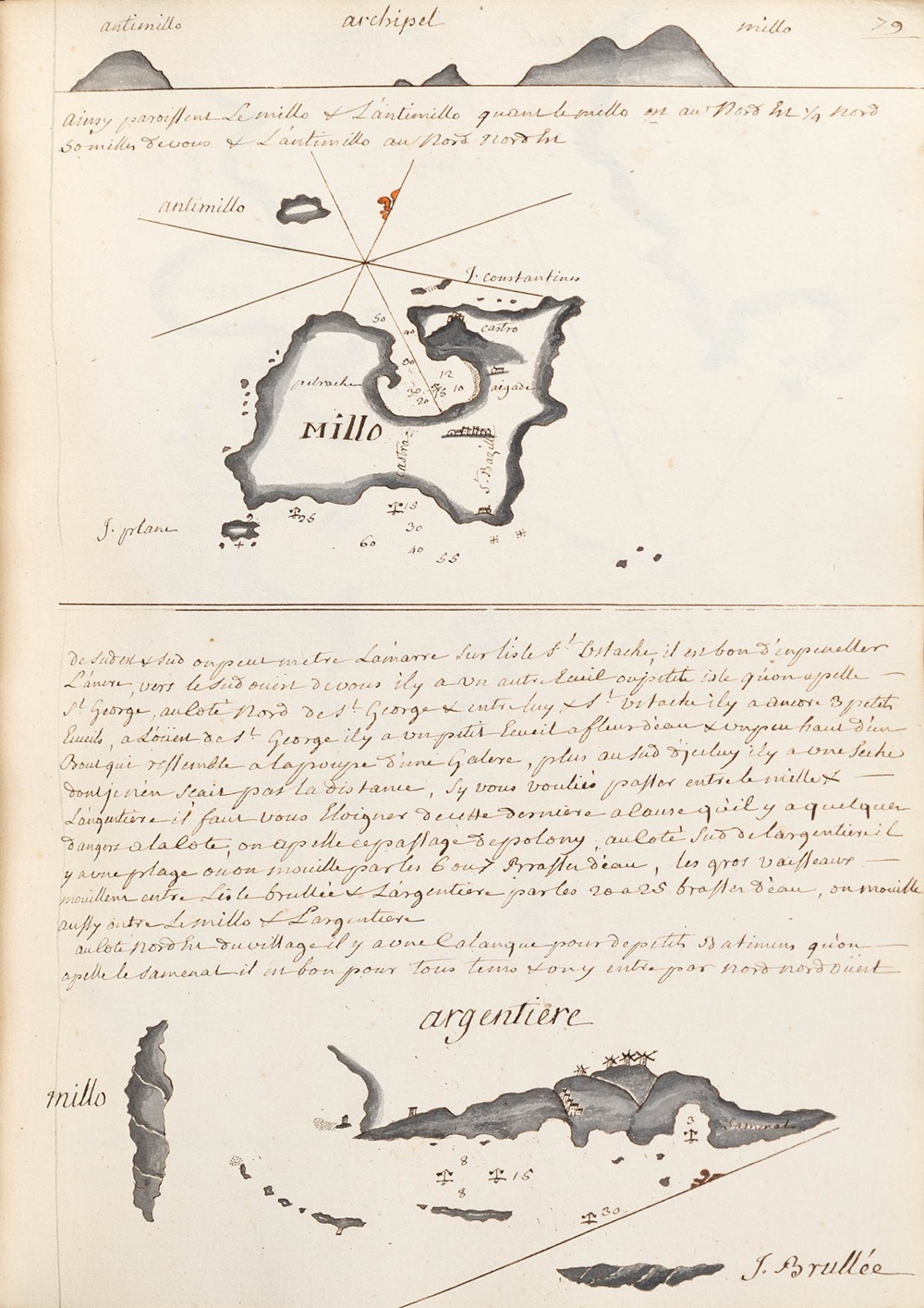 • Ένας πορτολάνος της Ελληνικής χερσονήσου, των νησιών του Αιγαίου, της Κρήτης, του Ιονίου πελάγους, της Αδριατικής, της Ιταλικής χερσονήσου, της Κορσικής και της Σαρδηνίας, που χρονολογείται στα μέσα του 18ου αιώνα. Οι πορτολάνοι θεωρούνται επίτευγμα της ναυσιπλοΐας της εποχής καθώς παρείχαν ιδιαίτερα χρήσιμες πληροφορίες ανάλογα με το λιμάνι προορισμού. Η κάθε περιγραφή του τόμου συνοδεύεται από λεπτομερέστατα σχεδιαγράμματα σχεδιασμένα πάντοτε με κλίμακα. Παρεμφερές χειρόγραφο του François Azan βρίσκεται στην Beinecke Rare Book & Manuscript Library του Yale University.