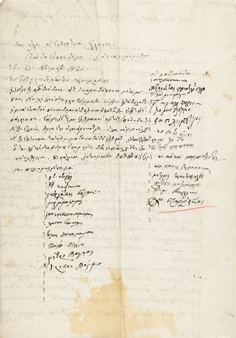 • Μία επιστολή με τις υπογραφές 25 οπλαρχηγών μεταξύ των οποίων οι Γεώργιος Καραϊσκάκης, Νικηταράς, Αθ. Κουτσονίκας, κ.ά. προς τους κατοίκους των Ψαρρών, με την οποία αναγγέλλουν την νίκη τους επί των Τούρκων στη Δομβραίνα Βοιωτίας και τον ηρωικό θάνατο του στρατηγού Γιαννάκη Σουλτάνη, ζητώντας παράλληλα να τους αποσταλούν πολεμοφόδια.