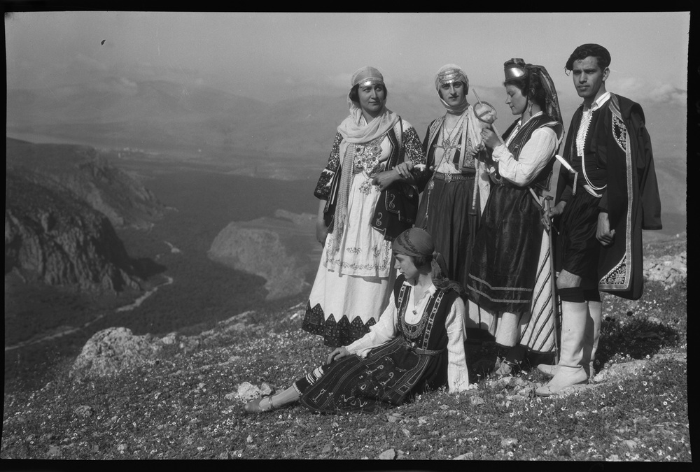 Nelly’s, (Έλλη Σουγιουλτζόγλου-Σεϊραδάρη), συνεργάτες της Έκθεσης Λαϊκής Χειροτεχνίας που διοργανώθηκε στο πλαίσιο των Δελφικών Εορτών, φορώντας ενδυμασίες από διάφορες περιοχές της Ελλάδας, Δελφοί 1930 (Μουσείο Μπενάκη).