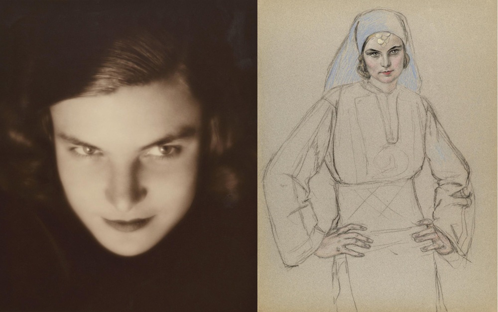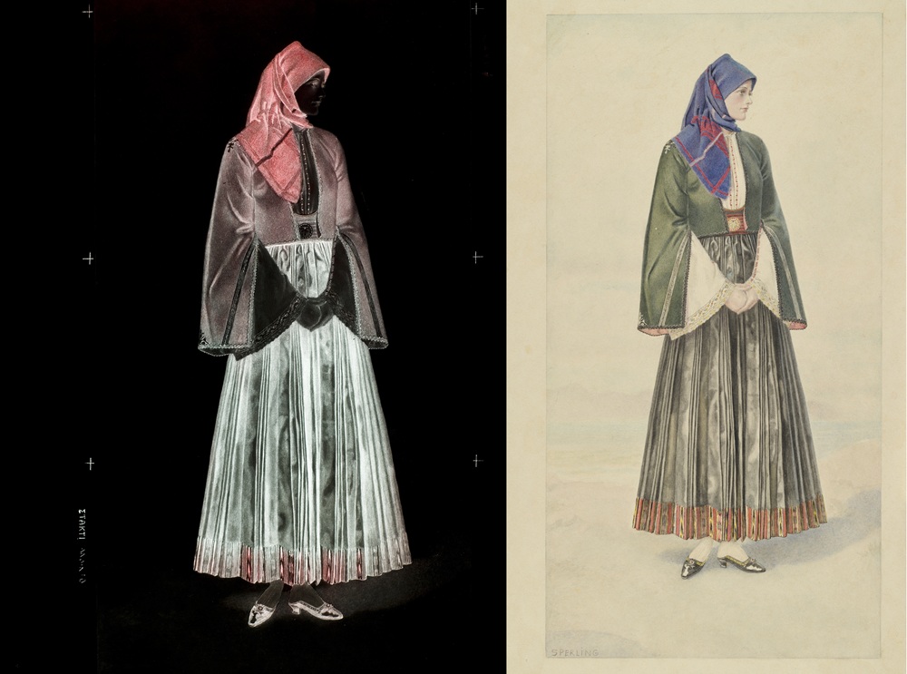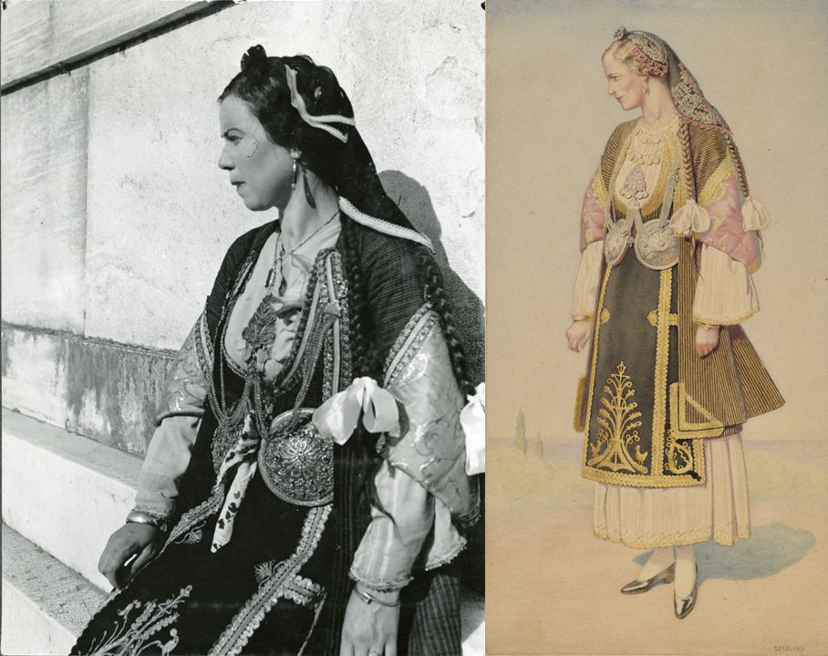 Nelly’s, (Έλλη Σουγιουλτζόγλου-Σεϊραδάρη), συνεργάτες της Έκθεσης Λαϊκής Χειροτεχνίας που διοργανώθηκε στο πλαίσιο των Δελφικών Εορτών, φορώντας ενδυμασίες από διάφορες περιοχές της Ελλάδας, Δελφοί 1930 (Μουσείο Μπενάκη).