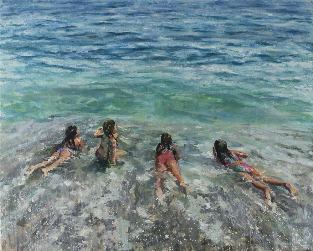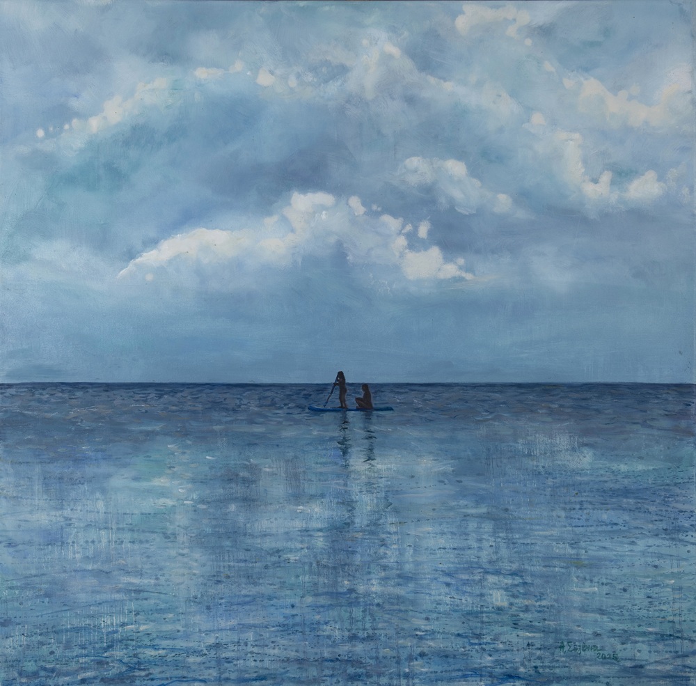 Στα έργα που παρουσιάζονται στη νέα της ατομική έκθεση, η θάλασσα ζωντανεύει με έντονα μπλε χρώματα και φωτεινές αντανακλάσεις, ενώ οι ανθρώπινες μορφές αλληλεπιδρούν στο χώρο με λυρικότητα και ευαισθησία. Κάθε καμβάς αποτυπώνει την κίνηση του νερού, τη διάχυση του φωτός και την ήρεμη ένταση της φύσης, δημιουργώντας έναν χώρο όπου ο θεατής μπορεί να ανακαλύψει στιγμές και να νιώσει την αίσθηση της θάλασσας και του φωτός.