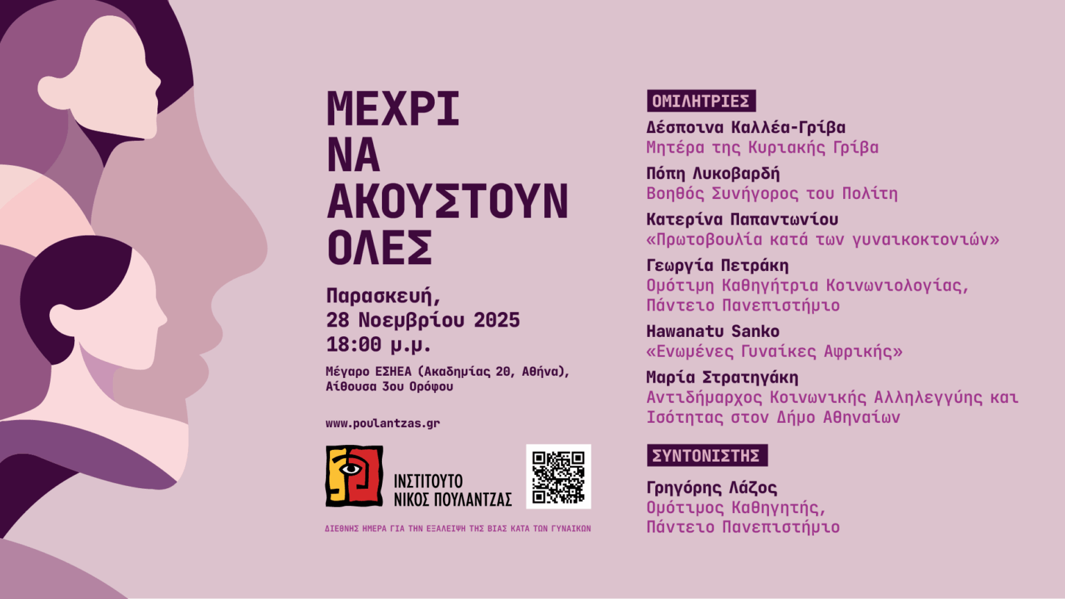 Με αφορμή τη Διεθνή Ημέρα για την Εξάλειψη της Βίας κατά των Γυναικών, το Ινστιτούτο Νίκος Πουλαντζάς διοργανώνει μια ανοιχτή εκδήλωση-διάλογο με τίτλο «Μέχρι να ακουστούν όλες».