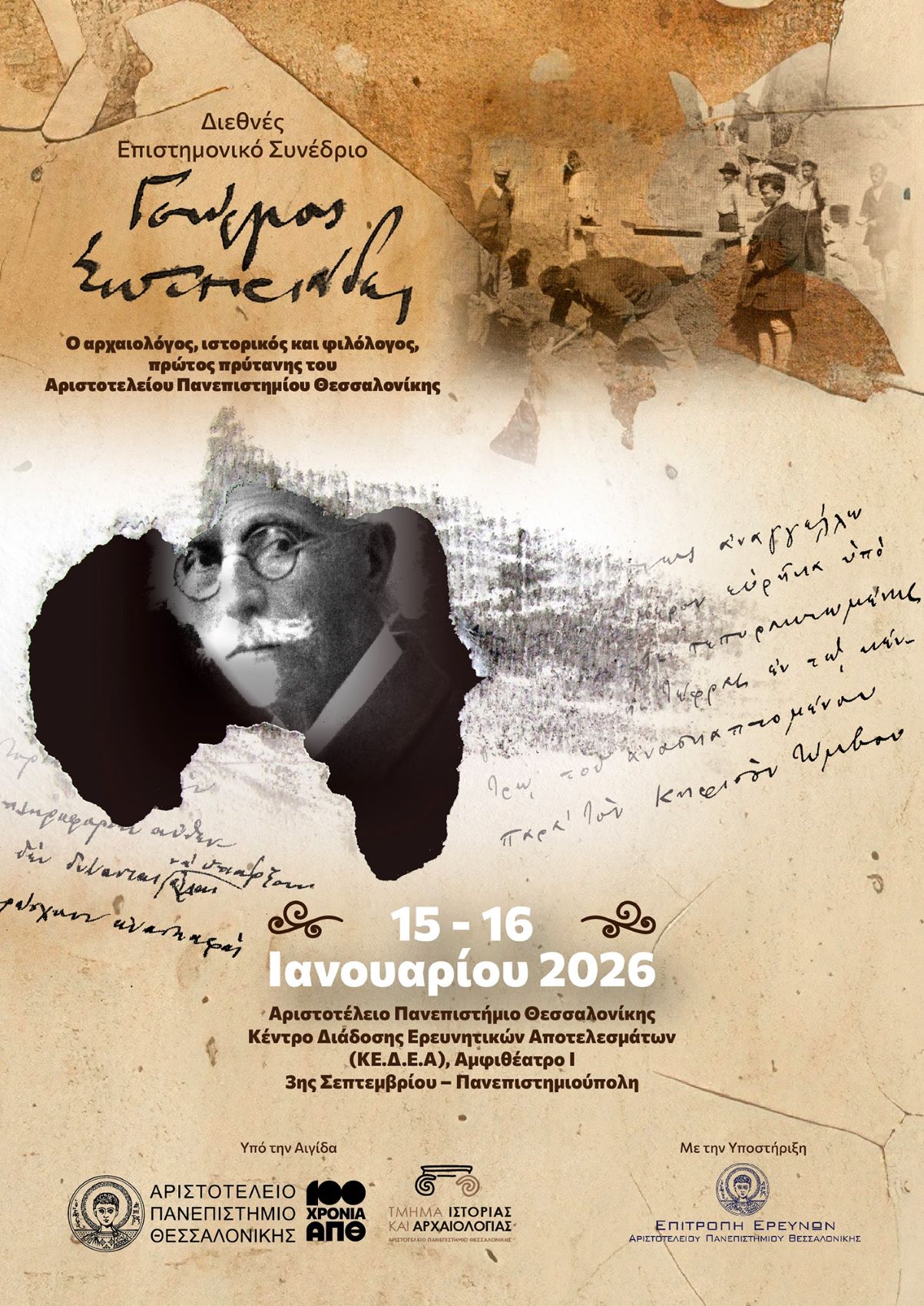 Το Συνέδριο, το οποίο θα πραγματοποιηθεί την Πέμπτη 15 και την Παρασκευή 16 Ιανουαρίου 2026, στο ΚΕΔΕΑ, είναι αφιερωμένο στη ζωή και στο πολυδιάστατο έργο του Γεώργιου Σωτηριάδη (1852-1942), του πρώτου Πρύτανη του Αριστοτελείου Πανεπιστημίου και διακεκριμένου αρχαιολόγου, ιστορικού και φιλολόγου. Η Τελετή Έναρξης θα πραγματοποιηθεί την Πέμπτη 15 Ιανουαρίου 2026 και ώρα 16.30.