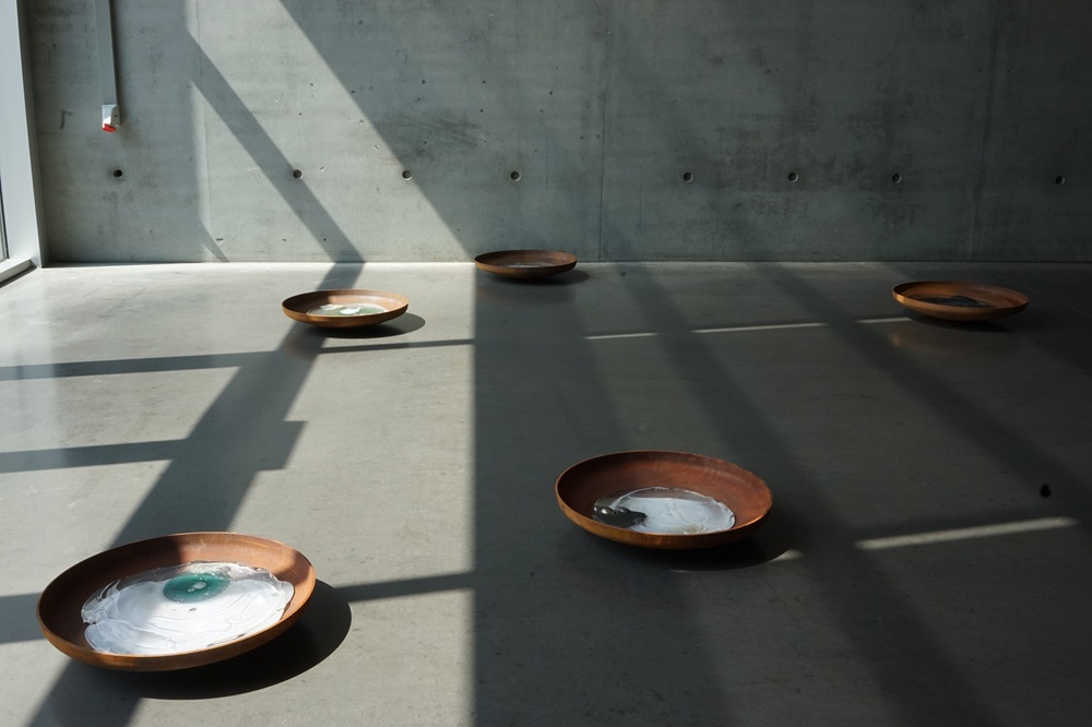 Rosella Biscoti, Stranded, 2021. Series of glass sculptures placed inside rusted metal bowls. Variable dimensions. Courtesy of the artist and mor charpentie gallery.