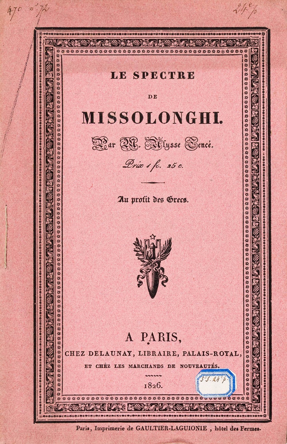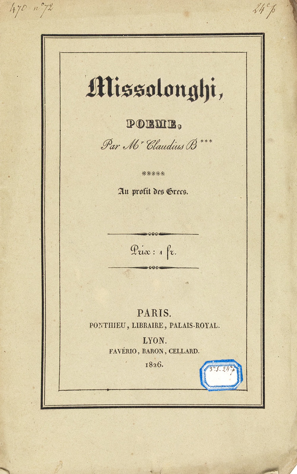 • Two rare philhellenic publications inspired by the Exodus of Missolonghi, the defining event of the Greek Revolution, which marks its 200th anniversary this year. These are two poems written immediately after the fall of Missolonghi, paying tribute to the heroic Exodus of the people of Missolonghi—an event that deeply moved international public opinion and gave new impetus to the Philhellenic movement. Both editions were sold “For the benefit of the Greeks,” as stated on their covers.