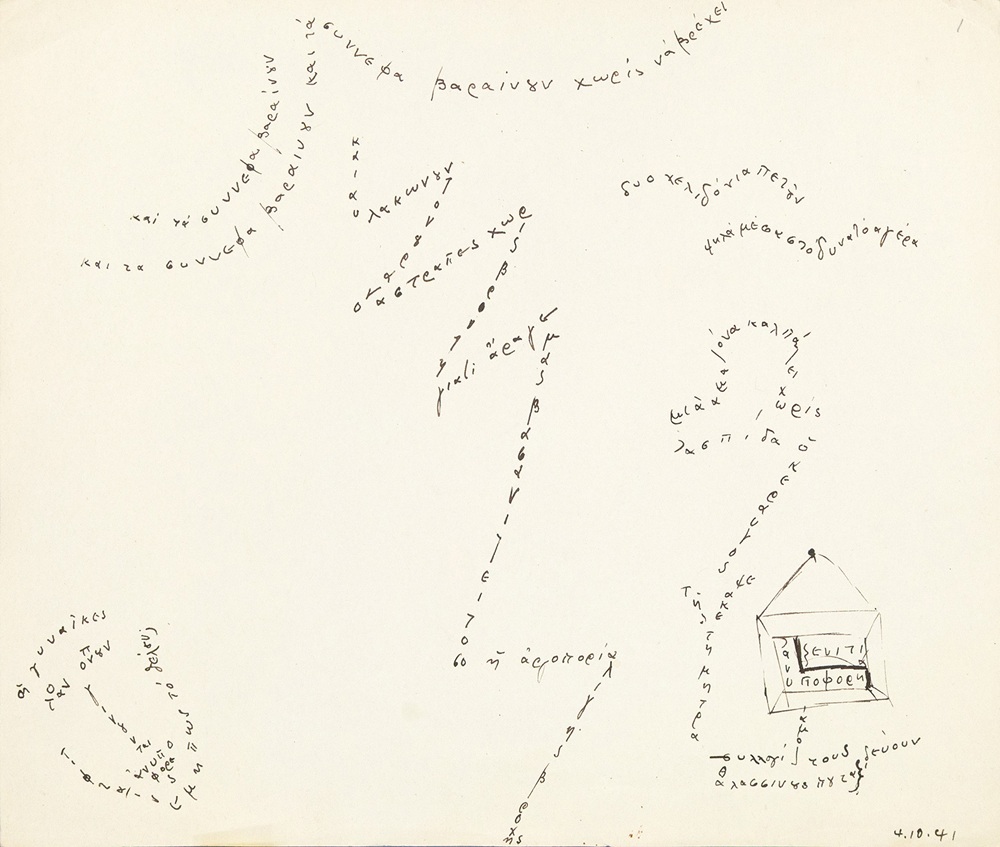 • Autographs of five poems from the section “Calligraphies” (1941–1942) by George Seferis. G. P. Savvidis, referring to the title and form of the Calligraphies manuscripts, notes that “it concerns poems whose verses are calligraphically rendered in such a way as to form an image related to the poem’s theme.”