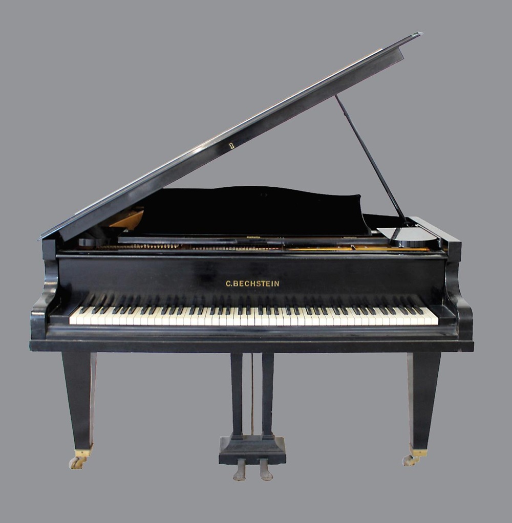 Black wooden piano with tail. It bears the manufacturer’s name, C. Bechstein.